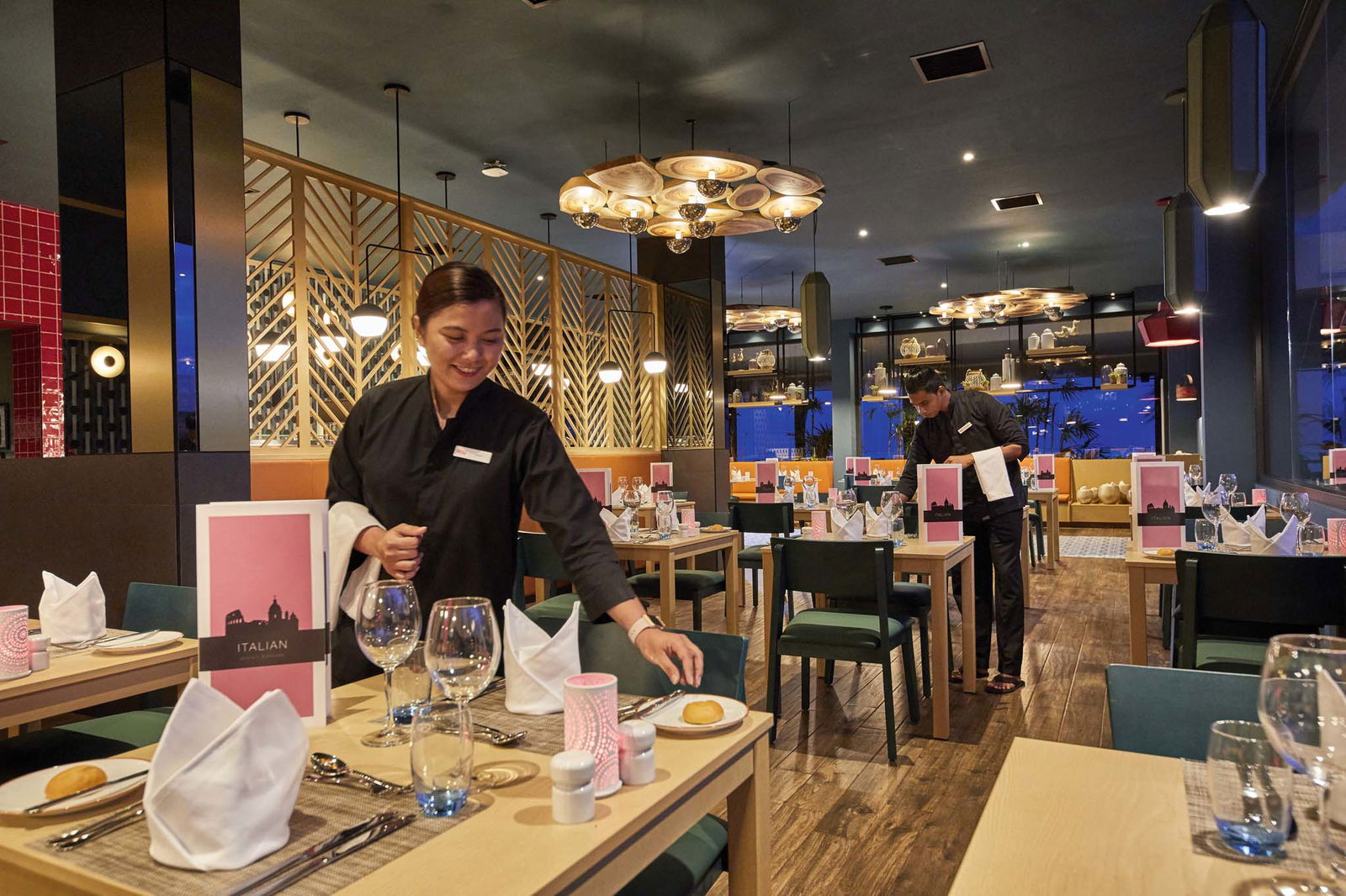 Hotel Riu Atoll provides guests with a pool with swim-up bar and impressive views of the sea, and another pool for children. You can also head to the beach and relax in the sun lounger area or go diving to contemplate the underwater beauty of this island paradise. During your stay at the hotel in Maafushi, you'll enjoy authentic culinary experiences thanks to the delicious dishes prepared by our chefs. The main restaurant serves buffet breakfasts with live cooking stations, and the Italian and steakhouse restaurants offer à la carte dining that is sure to impress you. And if you like to savour an aperitif or soft drink after a relaxing dip or while watching a stunning sunset, you have the Lounge Bar and the Sports Bar, open 24 hours.