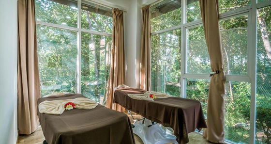 Azao Resort & Spa provides extensive wellness and leisure facilities, including a large swimming pool with a swim-up bar, a spa offering a range of treatments, a gym, and recreational activities, ideal for relaxation and rejuvenation in a tranquil environment